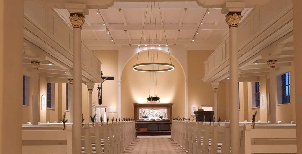 Den smukke kirke i Jels har gennemgået en indvendig totalrenovering, og her har Blue-Tech blandt andet stået for nye installationer og ny belysning.